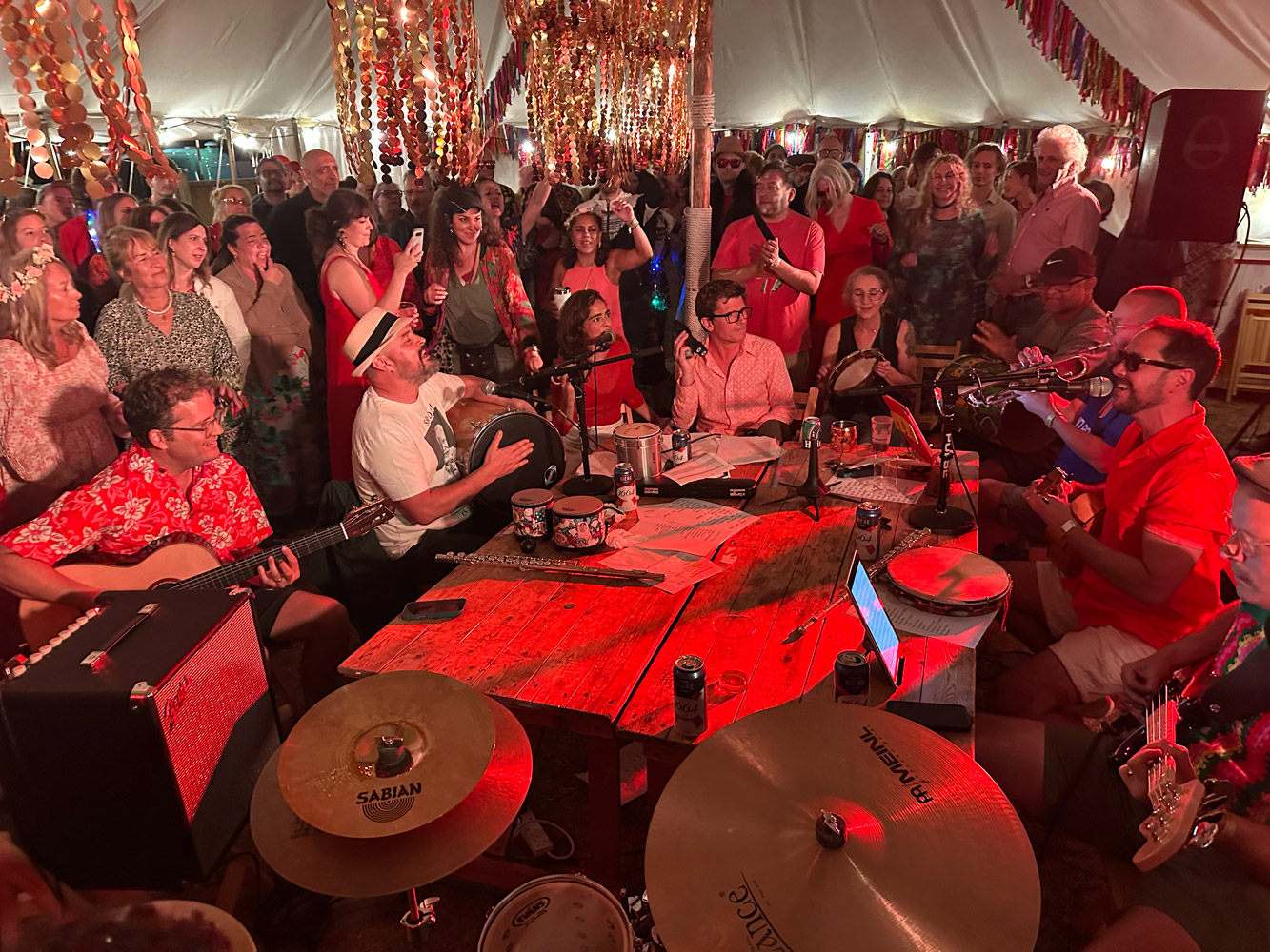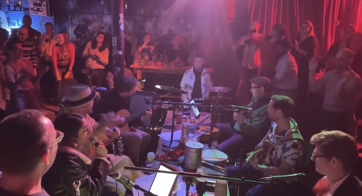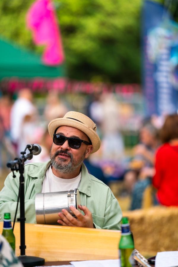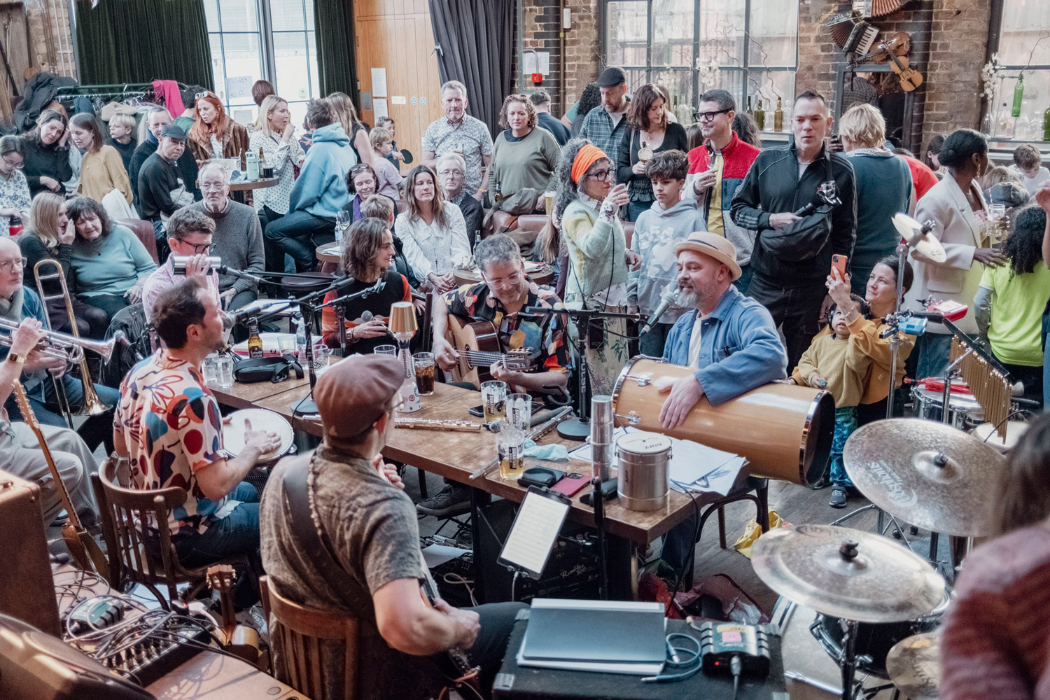 Space At The Table brings the Brazilian Roda de Samba to the UK. Musicians gathered around a table in the middle of the crowd, creating a shared musical experience.